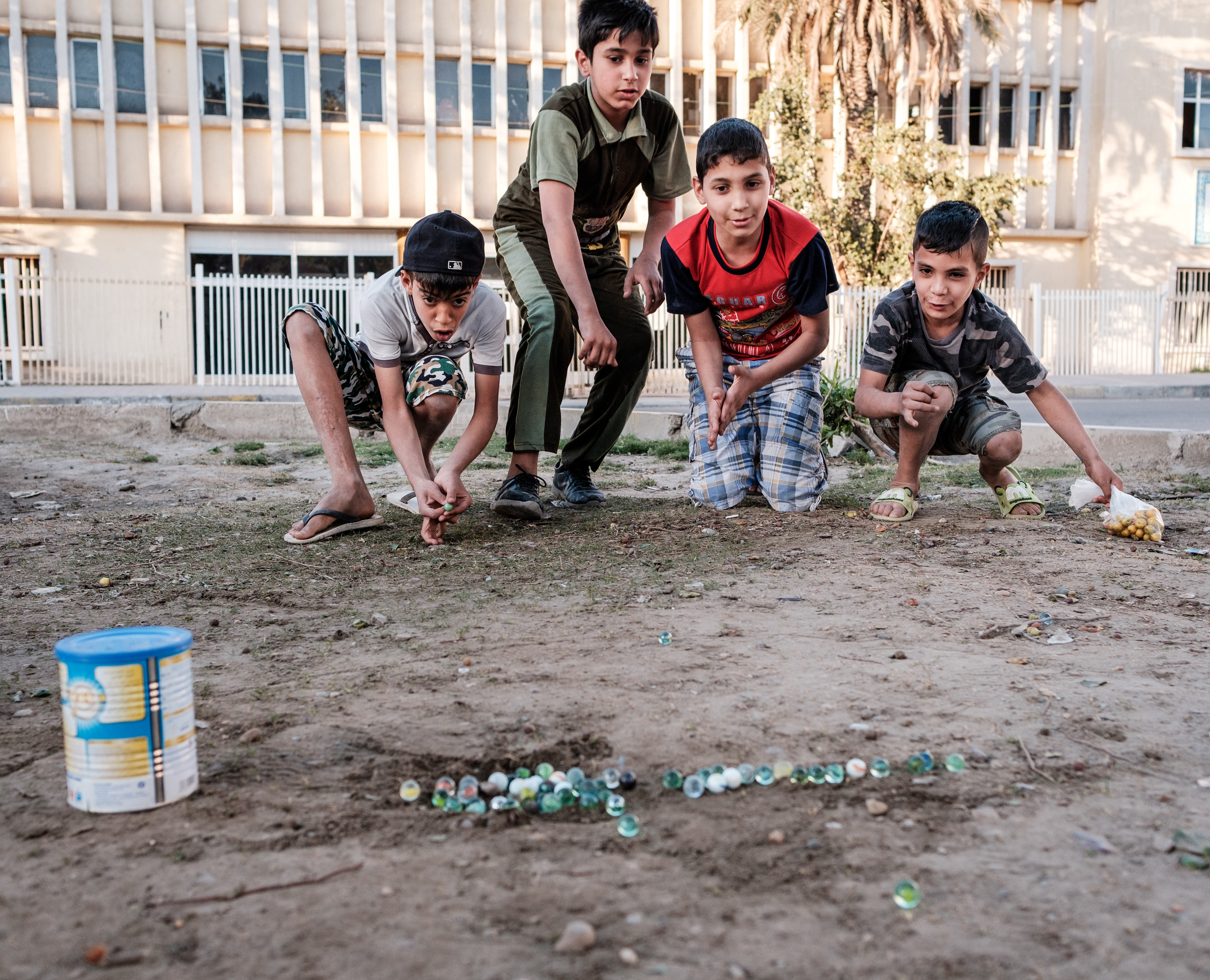 A group of young boys playing iraqi traditional game daabul in Baghdad. 2018