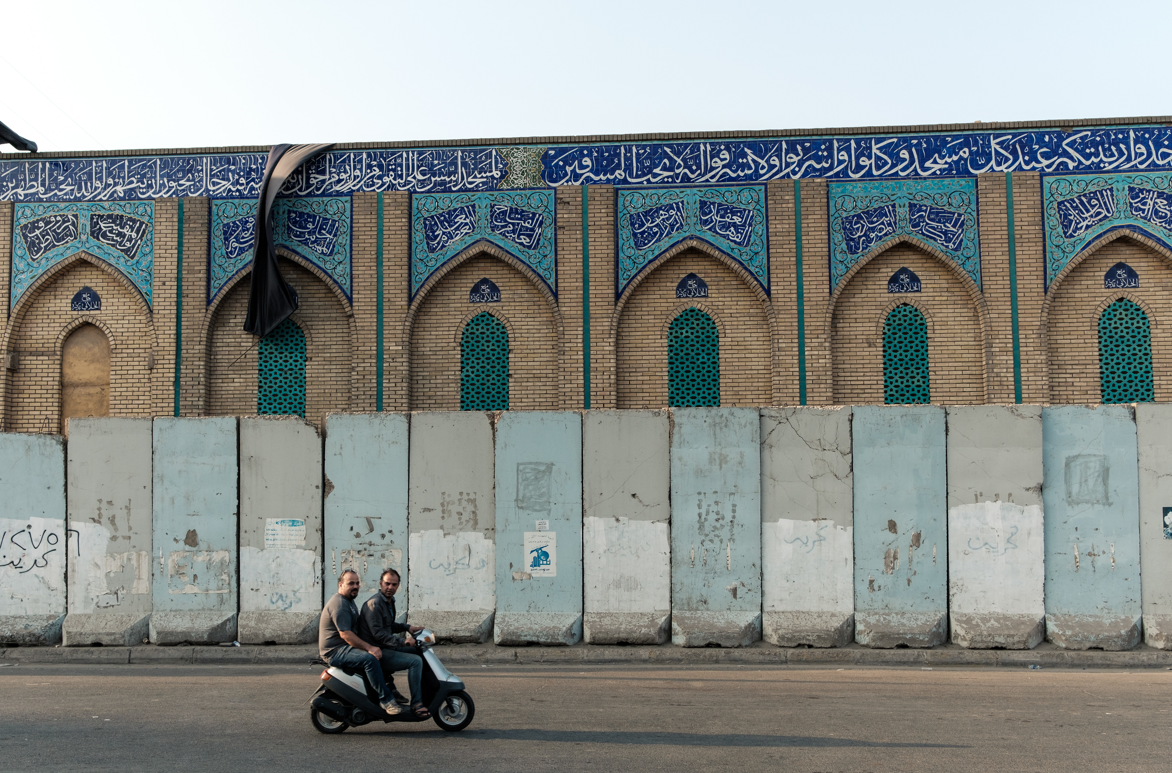 Iraqi men ride a motorcycle passing Al-Khilani Mosque in Baghdad Iraq.The Al-Khilani Mosque has been a subject of an explosion in 2007 when a truck bomb exploded in front of the mosque . At least 78 people were killed and another 218 injured in the blast. 2017
