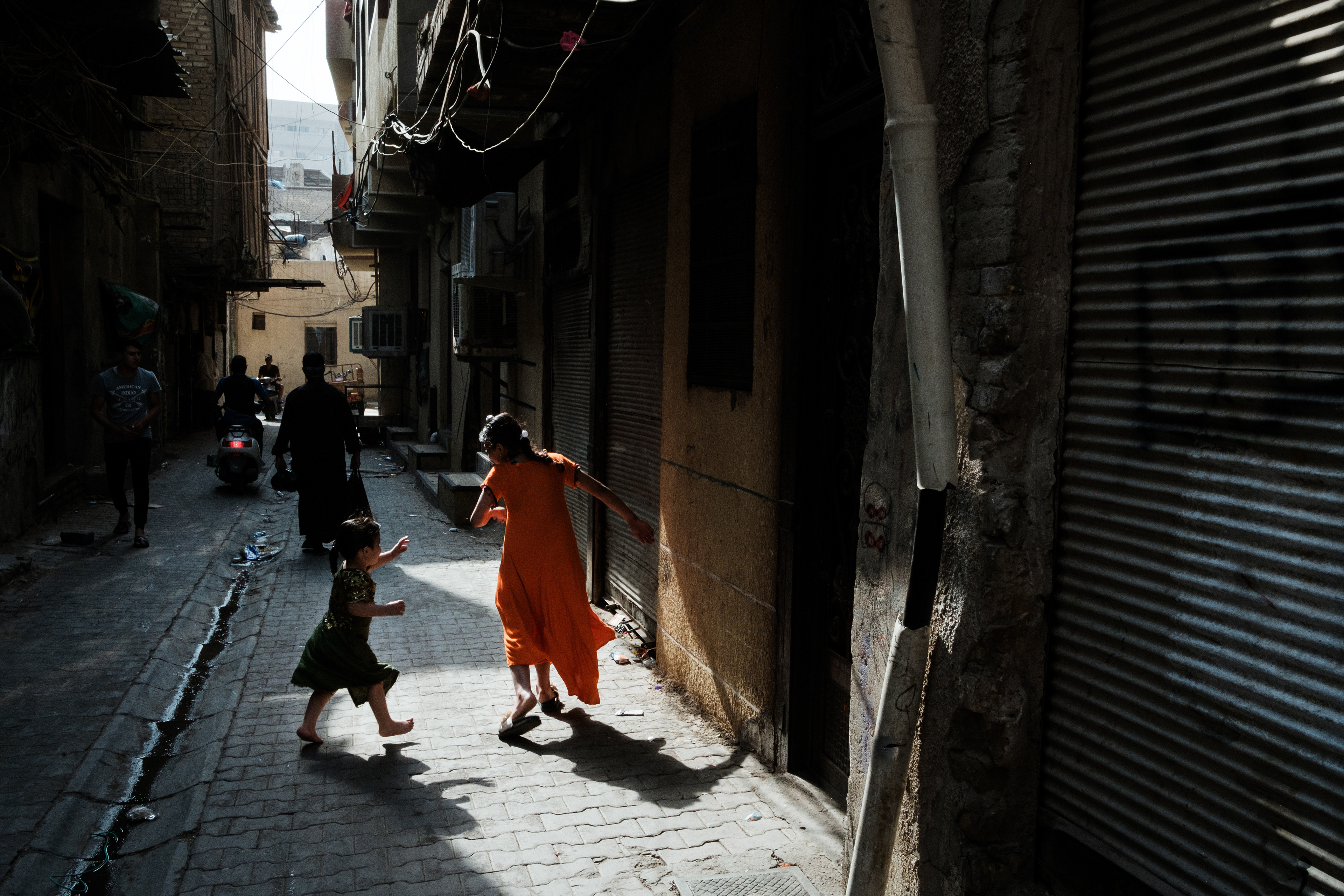 Two litte girls playing in a narrow alley of Al-torah neighborhood in Baghdad .2017